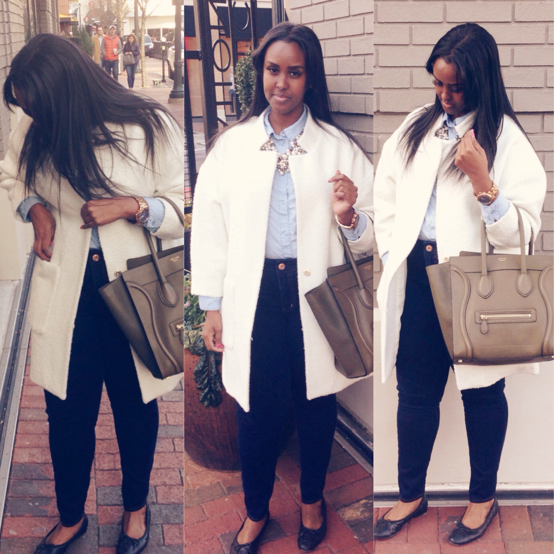 I’ve been on the hunt for the perfect winter coat for a while now. I knew I wanted a feminine silhouette that was well structured, think Olivia Pope! You can imagine how excited I was when I came across this white textured piece at H&M the other day. It’s the perfect length, hitting right at the knees. The shape reminds me of Jackie O, but the cutouts around the neck definitely makes it more modern. I decided to pair it with an all denim outfit and a statement necklace. xo- Habon