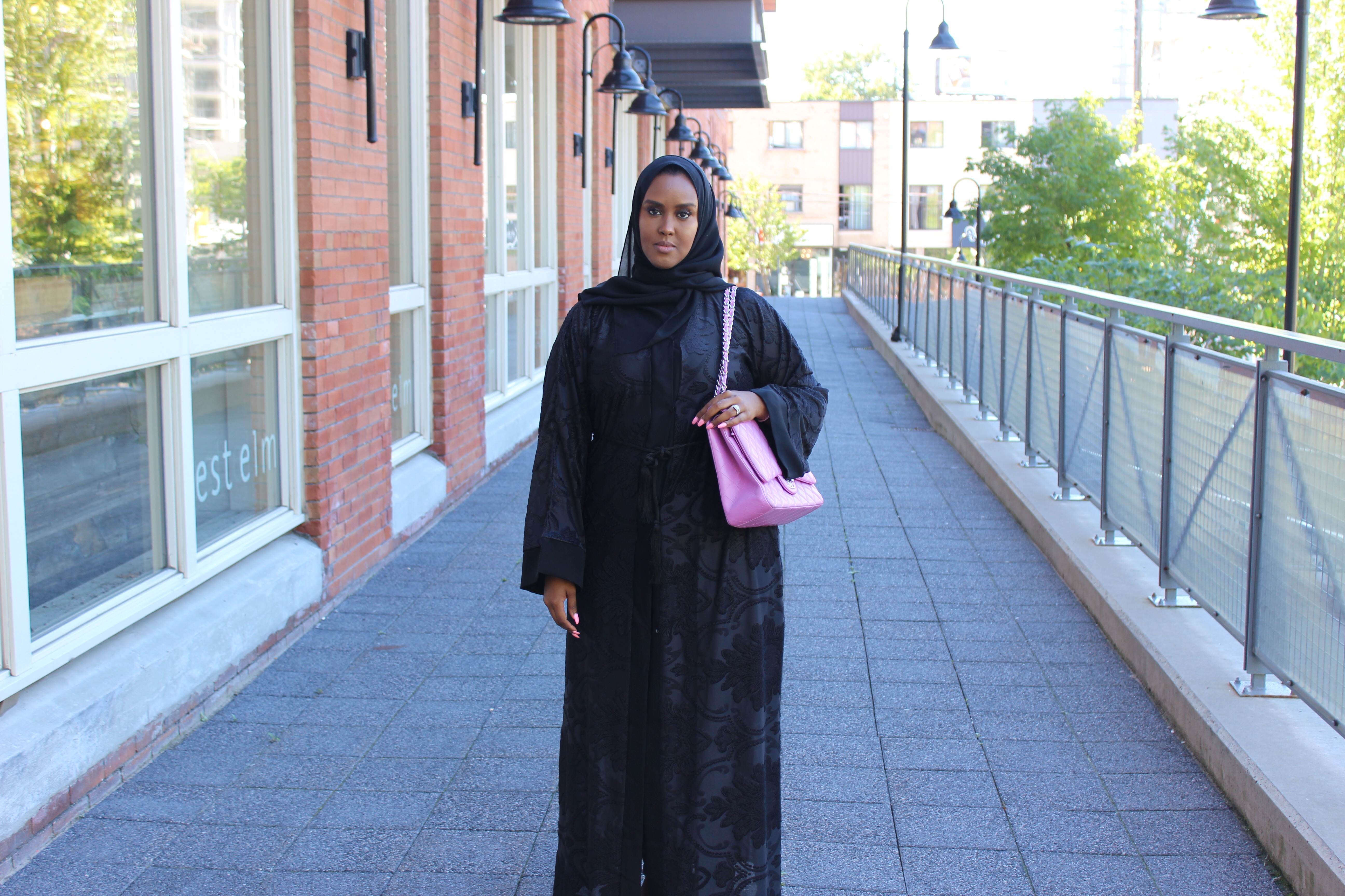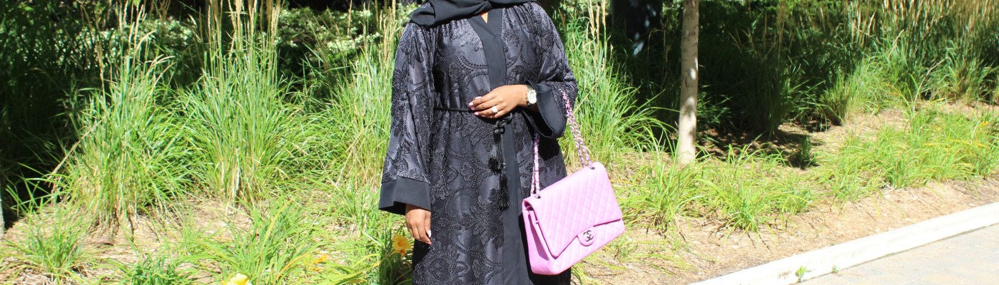 Happy Friyay! This week has gone by fast thanks to the long weekend and celebration of Eid. I shared my Eid brunch with all of you the other day here, but I decided to wait to showcase my outfit for Fashion Friday! Before every Eid I always try to find the perfect abaya that’s both modest yet fashion forward, and sometimes it’s hard finding the perfect one, but this Eid it was pretty easy to find that combo thanks to my good friend Hodman who co-owns the abaya line The Cloak with sister Yasmin and friend Hotho. I missed their first pop up shop, since I was in VA for a wedding. Luckily they did a second pop up shop the following weekend here in Toronto, and I was able to grab myself this lovely black lace abaya. Although black abayas are super common, the lace intricate detail and rope belt made this one a stand out. Plus one can never have too much black! I wore the shayla (hijab) that came with the abaya which was a simple sheer black scarf and my black open toed heels I snagged from Aldo earlier this summer. I decided to pull out my beloved Chanel classic flap which added the perfect punch of color to this all black ensemble. Hope you enjoy this Fashion Friday post and would love to see your Eid outfits! -Habon xo